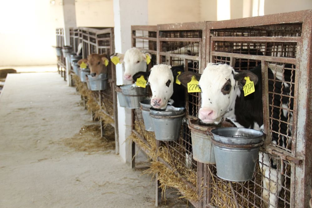 Milk calves are kept in individual cages. Feed them with whole pasteurized milk twice a day for 4 liters each time. Calf is weaned when it eats at least 1.5 kg of feed mix per day (within 3 days). Water and feed mix are near them from the first days of life.