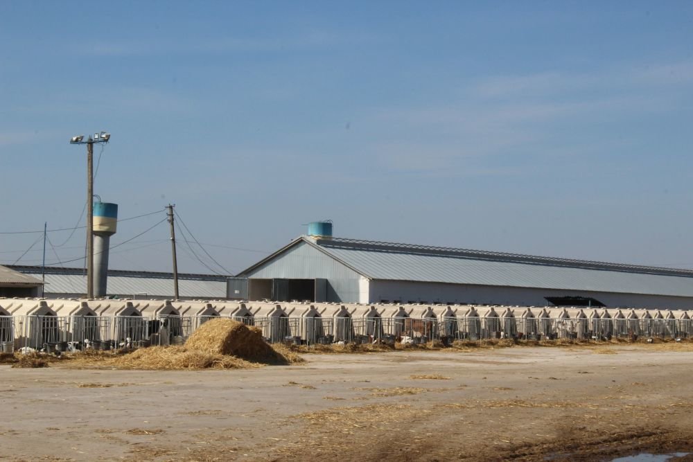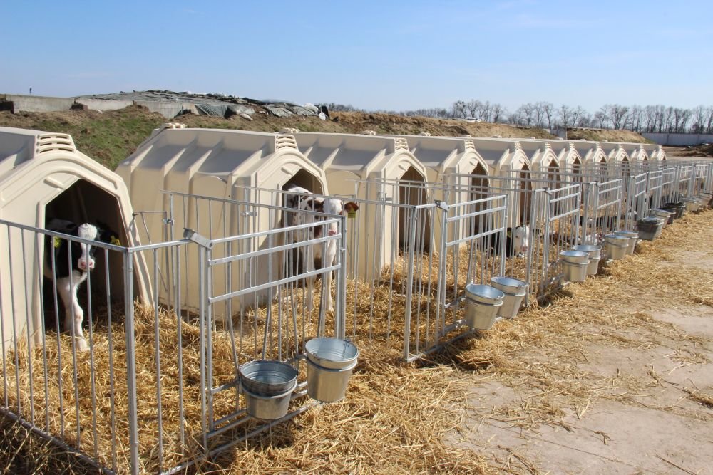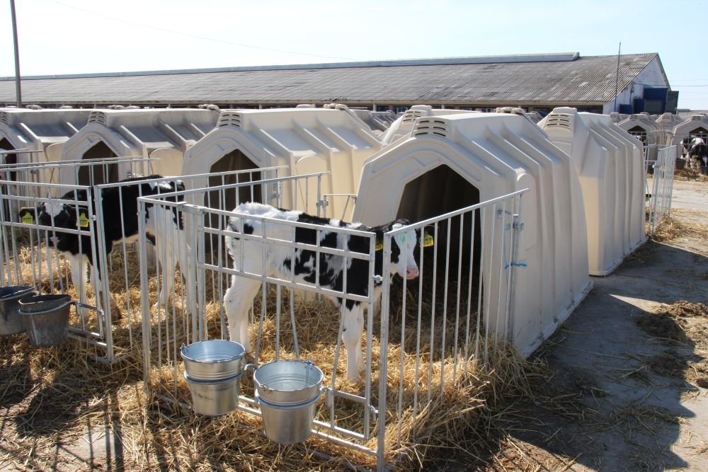 Milk calves are kept in individual houses. They drink 3 liters of whole pasteurized milk three times a day. Calves are weaned when it eats 2 kg of mixed feed (50th day of life).