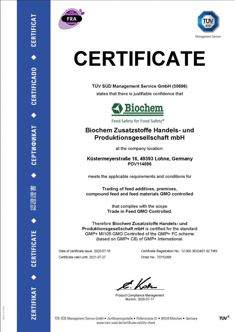 Исключение генетически модифицированных организмов (ГМО) не только играет важную роль в производстве органических продуктов животного происхождения (молока, мяса и яиц). Как правило, в Европейском союзе существует высокий спрос на пищевые продукты животного происхождения, не содержащие ГМО, независимо от того, происходят они из органических или традиционных источников. В некоторых странах, включая Германию и Францию, были приняты законы, согласно которым продукты животного происхождения (молоко, мясо и яйца) маркируются как продукты, не содержащие ГМО. Использование кормов, не содержащих ГМО, является предпосылкой для производства и маркировки пищевых продуктов, не содержащих ГМО. В рамках нашей сертификации GMP + MI105 Контроль ГМО, копания Biochem отвечает этому требованию производства и маркировки кормов как не содержащих ГМО (Контроль ГМО). Стандарт GMP + MI105 ГМО контроль является признанным сертификатом, эквивалентным немецкому стандарту VLOG.