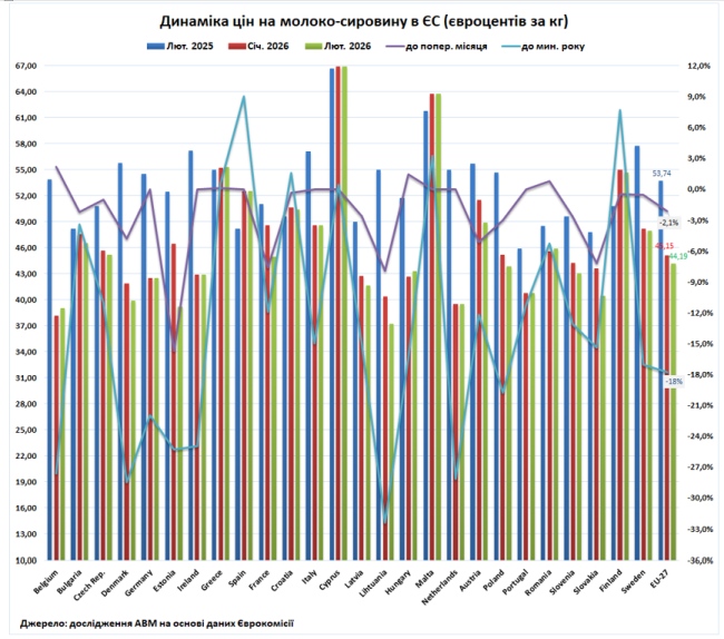 За попередніми даними Єврокомісії, у лютому 2026 року середня ціна на молоко-сировину в ЄС становила 44,19 євроцентів за кг, що на 2,13% менше ніж у січні 2026 року. Відносно ціни станом на лютий 2025 року, молоко в ЄС здешевіло на 17,77%. У лютому ціна на молоко екстраґатунку в Україні становила 30,55 євроцентів за кг.
