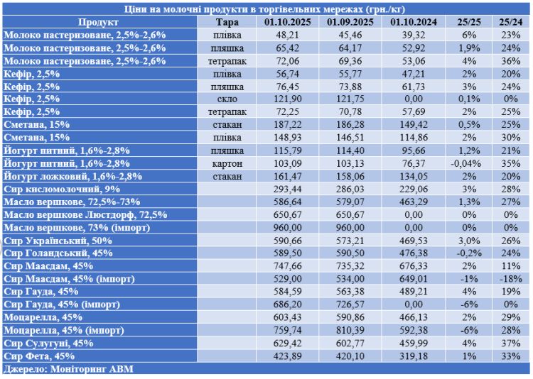 Молоко пастеризоване жирністю до 2,6% в плівці в середньому коштує 48,21 грн. за кг, що на 2,75 грн. (+6%) більше порівняно з попереднім місяцем, але на 8,89 грн. (+23%) більше відносно минулорічного періоду. Найдешевшим молоком в плівці вагою 900 г є молоко бренду «Адаліс», яке коштує 39,43 грн. за кг, а найдорожчим бренду «Яготинське» — 56,38 грн. за кг.