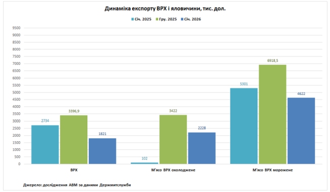 За попередніми даними Держмитслужби, у січні 2026 року Україна експортувала близько 958 т ВРХ живою вагою, що на 36% менше відносно грудня 2025 року і на 33% менше відносно січня 2025 року. Грошова виручка за експортованих тварин становила 1,82 млн. дол., що на 46% менше відносно грудня 2025 року і на 33% менше відносно січня 2025 року.