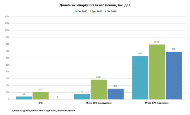 У січні 2026 року Україна не імпортувала ВРХ. Обсяги імпорту охолодженої яловичини скоротилися до 6 т (-54%), а мороженої яловичини до 81 т (-18%) відносно попереднього місяця. Відносно січня 2025 року натуральні обсяги імпорту охолодженої яловичини виросли на 20%, а мороженої яловичини скоротилися на 23%.