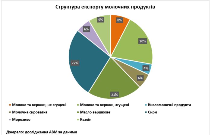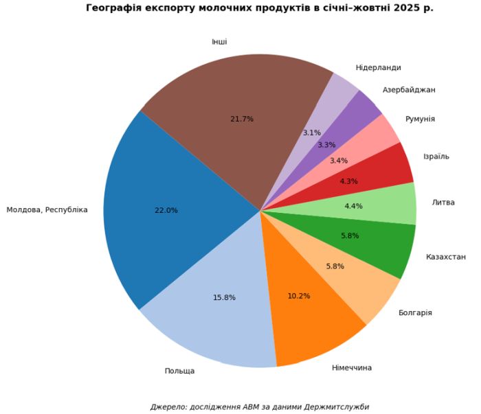 Щодо географії експорту, то в січні-жовтні 2025 року найбільші обсяги молока та вершків, не згущених (92%), кисломолочних продуктів (84%), масла вершкового (29%) та сиру (34%) були відвантажені в Молдову, молока та вершків, згущених (19,5%), молочної сироватки (34%) та казеїну (49%) в Польщу, а морозива (29%) в Німеччину.