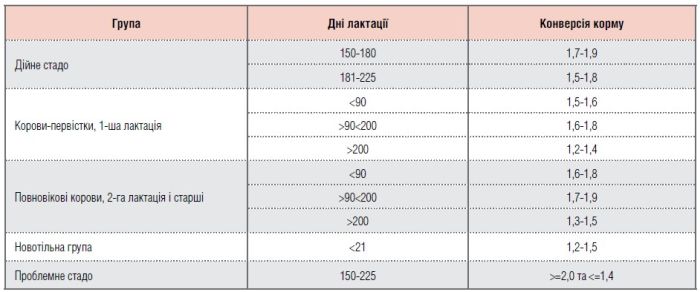 Таблиця 1. Показники конверсії корму для моніторингу ефективності годівлі