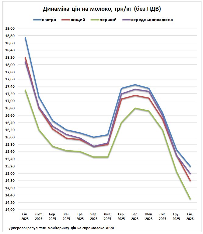 Середня закупівельна ціна молока екстра ґатунку станом на 7 січня становила 15,20 грн/кг без ПДВ, що на 80 коп. менше відносно попереднього місяця. Діапазон цін на цей ґатунок в господарствах варіюється від 14,30 до 15,50 грн/кг без ПДВ. Нижній діапазон цін знизився на 1,30 грн., а верхній — на 80 коп.