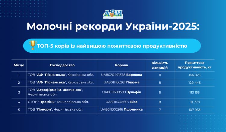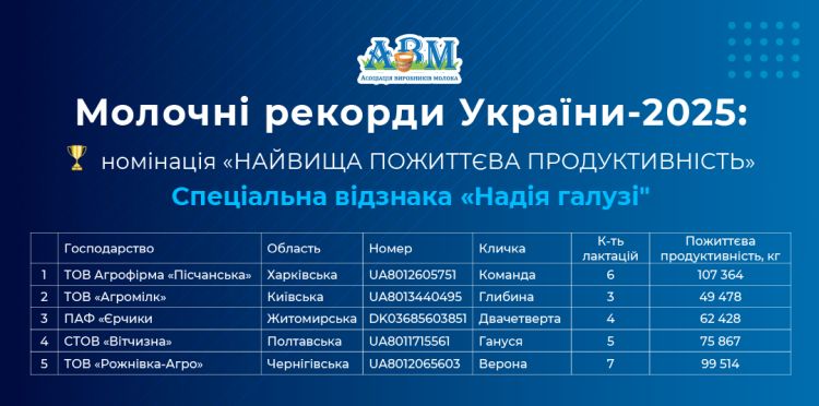 Примітка. ТОП-5 корів у номінації «Найвища пожиттєва продуктивність» — незалежне визначення корів, що утримуються на українських молочнотоварних фермах та мають найвищу пожиттєву продуктивність (надій молока) шляхом порівняння показників максимального пожиттєвого валового надою (станом на 01.01.2025, на момент подачі заявки номінантка повинна продовжувати працювати у стаді).