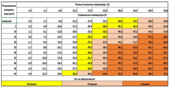 Таблиця 1. Температура вітру на основі температури повітря та швидкості вітру.