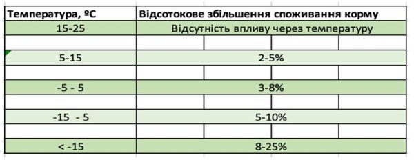 Споживання сухої речовини може сильно коливатися в зимові місяці, оскільки температура падає, а також необхідно підвищити рівень енергії. Нерідкі випадки, коли потребують на додаткових 20% більше корму в холодну погоду (Таблиця 2.) для підтримки стану тіла, продуктивності та здоров’я.