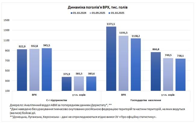 В присадибному секторі знаходиться 1 млн. 138,2 тис. голів ВРХ, що на 53 тис. голів менше (-4,5%) порівняно до 1 вересня 2025 року. Кількість корів в господарствах населення станом на 1 жовтня 2025 року становила 738,1 тис. голів, що на 11 тис. голів менше (-1,5%) ніж місяць тому. За останній рік кількість ВРХ в господарствах населення скоротилася на 233 тис. голів (-17%), а кількість корів зменшилася на 129 тис. голів (-15%).