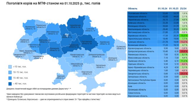 За попередніми даними Держстату, зростання чисельності поголів'я корів зафіксовано на сільськогосподарських підприємствах в Харківській області (+16%), Рівненській області (+13%), Миколаївській області (+12%), Івано-Франківській області (+11%), Хмельницькій області (+9%), Чернігівській області (+6%), Львівській області (+5%), Тернопільській області (+4%), Волинській області (+4%), Черкаській області (+4%), Житомирській області (+2%), Полтавській області (+1%). порівняно до 1 жовтня минулого року.