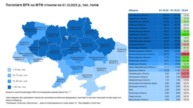 За попередніми даними Держстату, станом на 1 жовтня 2025 року в присадибному і промисловому секторі України утримується 2 млн. 83,7 тис. голів ВРХ, у тому числі 1 млн. 121,7 тис. корів. Порівняно до 1 вересня 2025 року, поголів'я ВРХ в Україні скоротилося на 40,6 тис. голів (-1,9%), а чисельність корів скоротилася на 9,3 тис. голів (-0,8%). Порівняно до 1 жовтня 2024 року поголів'я ВРХ скоротилося на 211 тис. голів (-9%), у тому числі корів — на 121 тис. голів (-10%). Близько 45% тварин утримується на промислових підприємствах, а 55% — в господарствах населення.