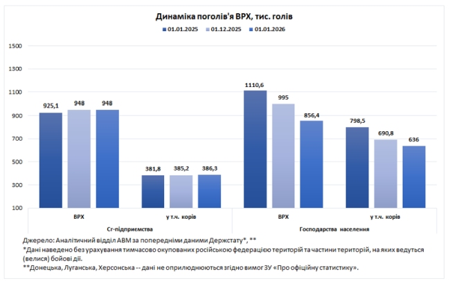 В присадибному секторі знаходиться 856,4 тис. голів ВРХ, що на 139 тис. голів менше (-14%) порівняно до 1 грудня 2025 року. Кількість корів в господарствах населення станом на 1 січня 2026 року становила 636 тис. голів, що на 55 тис. голів менше (-8%) ніж місяць тому. За останній рік кількість ВРХ в господарствах населення скоротилася на 254 тис. голів (-23%), а кількість корів зменшилася на 163 тис. голів (-20%).