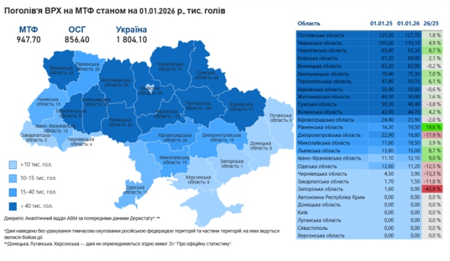 За попередніми даними Держстату, станом на 1 січня 2026 року в присадибному і промисловому секторі України утримується 1 млн 804,1 тис. голів ВРХ, у тому числі 1 млн 22,3 тис. корів. Порівняно до 1 грудня 2025 року, поголів'я ВРХ в Україні скоротилося на 138,9 тис. голів (-7%), а чисельність корів скоротилася на 53,7 тис. голів (-5%). Порівняно до 1 січня 2025 року поголів'я ВРХ скоротилося на 232 тис. голів (-11%), у тому числі корів — на 158 тис. голів (-13%).