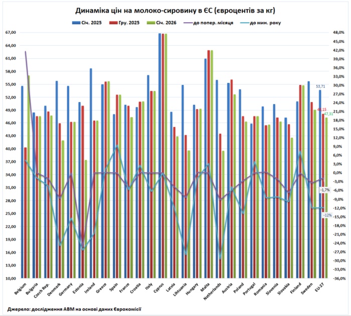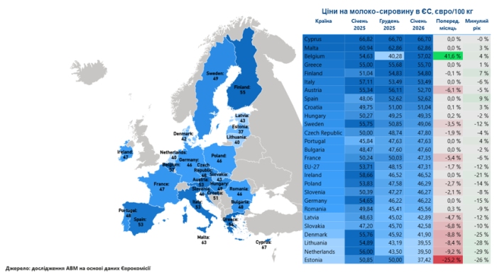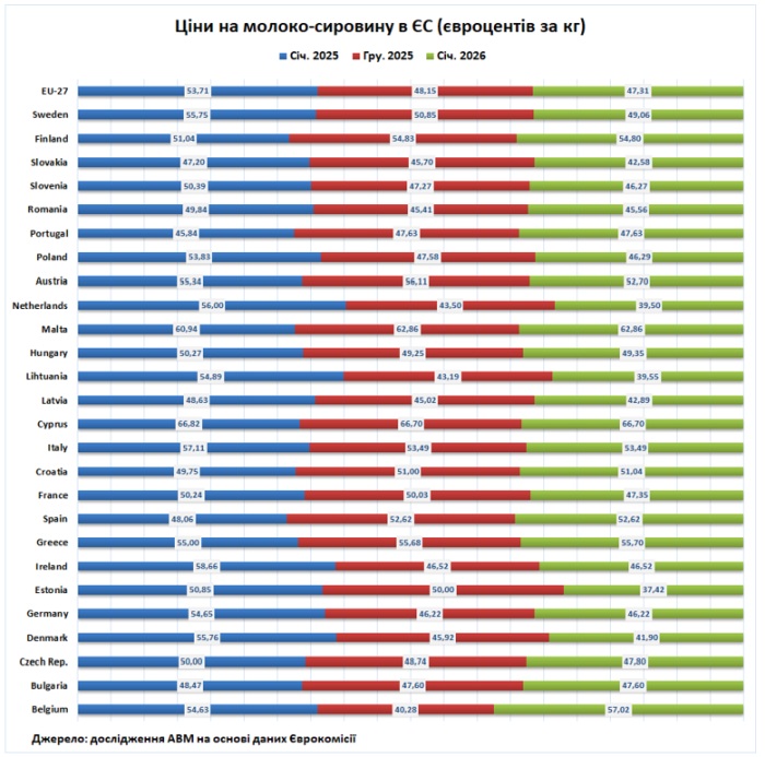 За попередніми даними Єврокомісії, у січні 2026 року середня ціна на молоко-сировину в ЄС становила 47,31 євроцентів за кг, що на 1,74% менше ніж у грудні 2025 року. Відносно ціни станом на січень 2025 року, молоко в ЄС здешевіло на 11,92%. У січні ціна на молоко екстраґатунку в Україні становила 31,89 євроцентів за кг.