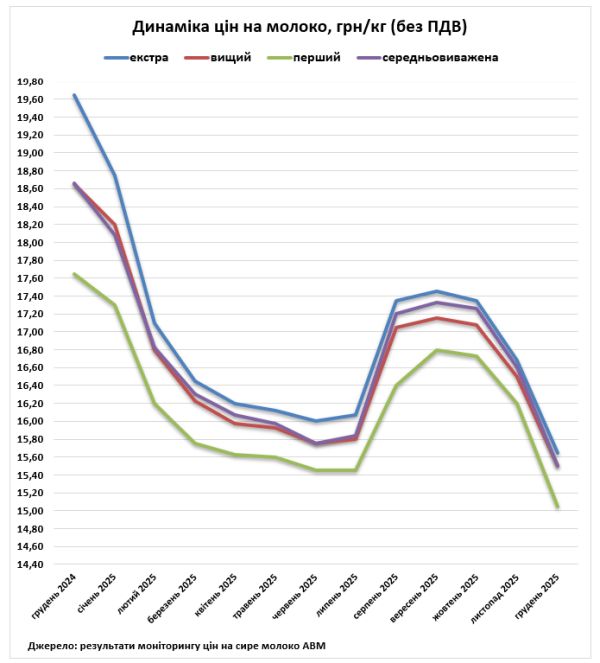 Середня закупівельна ціна молока екстра ґатунку станом на 20 грудня становила 15,30 грн/кг без ПДВ, що на 1,00 грн. менше відносно попереднього місяця. Діапазон цін на цей ґатунок в господарствах варіюється від 14,80 до 16,00 грн/кг без ПДВ. Нижня межа цінового діапазону знизилась на 1,20 грн., а верхня межа знизилась на 80 коп.