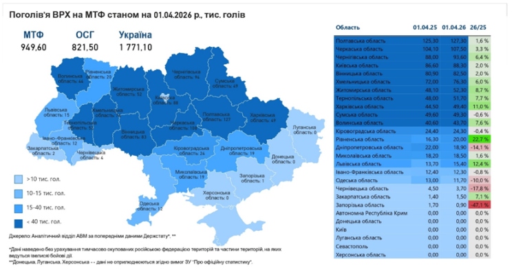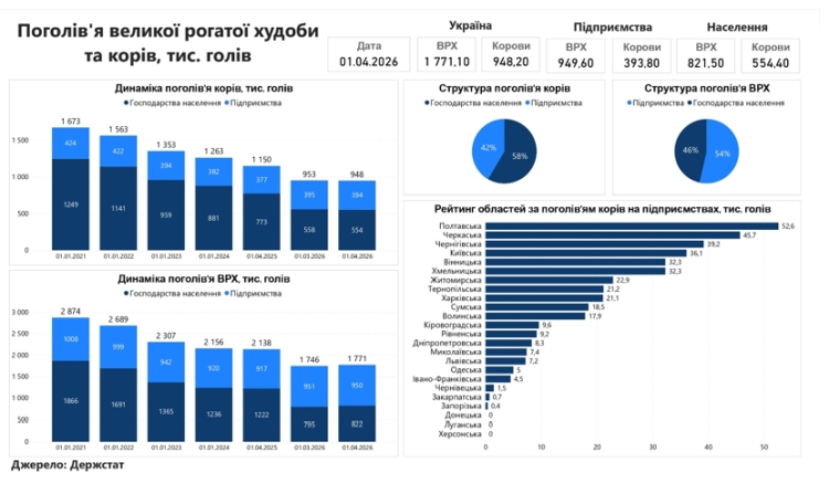 За попередніми даними Держстату, станом на 1 квітня 2026 року у присадибному і промисловому секторі України утримується 1 млн. 771,1 тис. голів ВРХ, у тому числі 948,2 тис. корів. Порівняно до 1 березня 2026 року чисельність корів скоротилася на 4,9 тис. голів (-1%). Порівняно до 1 квітня 2025 року поголів'я ВРХ скоротилося на 367 тис. голів (-17%), у тому числі корів — на 202 тис. голів (-18%). Близько 54% тварин утримується на промислових підприємствах, а 46% — у господарствах населення.