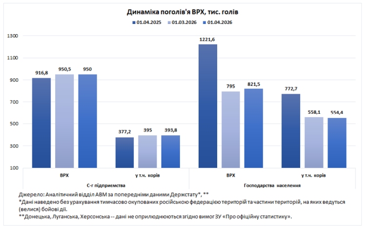 Кількість корів у господарствах населення станом на 1 квітня 2026 року становила 554,4 тис. голів, що на 4 тис. голів менше (-1%) ніж місяць тому. За останній рік кількість ВРХ у господарствах населення скоротилася на 400 тис. голів (-33%), а кількість корів зменшилася на 218 тис. голів (-28%).