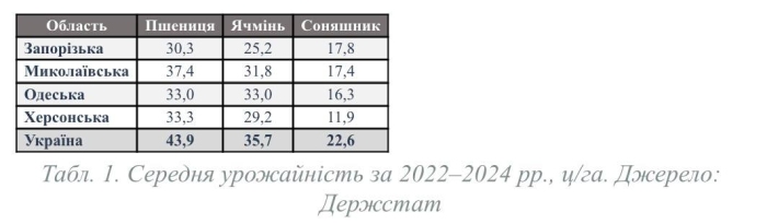 Пшениця — основа виробничого портфеля регіону, 35−45% посівних площ. Її урожайність у 2022−2024 роках: від 15 до 31% нижче середнього рівня. Соняшник — друга культура за значимістю для регіону, попри глибшу кореневу систему і більшу посухостійкість, демонструє аналогічну картину: відхилення від середнього сягає 21−47%.