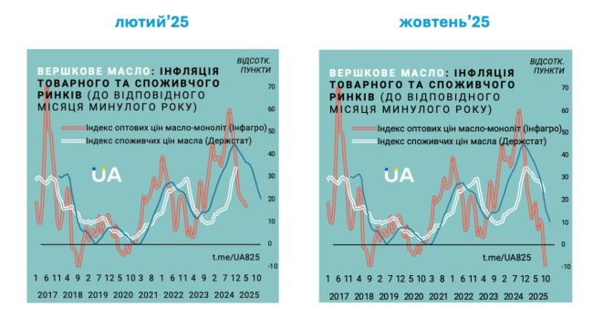 Драйвером зниження споживчих цін був товарний ринок, тобто нефасоване масло, переважно по 20 кг («моноліт»). Річна інфляція цієї позиції з 60% у вересні 2024 року перетворилась на дефляцію в жовтні 2025 року (орієнтовно -10% і нижче). Середнє ковзне для цього ряду з певним лагом корелює з продовольчою інфляцією. Тренд в лютому показував споживчу інфляцію на кінець 2025 року на рівні 20%, але через активне зниження темпів інфляції масла на товарному ринку, поточний рівень на кінець року складає близько 10%.