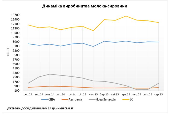 На скорочення обсягів молочного експорту ЄС вплинули вищі ціни на сухе незбиране молоко європейського виробництва, яке дорожче ніж пропозиція постачальників з інших регіонів. На збільшення пропозиції масла в Європі також вплинуло збільшення імпорту. Нові торговельні домовленості ЄС та США передбачають, що європейці мають щороку купувати в США без мит до 20 тис. т молочних продуктів, зокрема вершкового масла. Надлишки нереалізованих біржових товарів стримують ріст закупівельних цін на молоко-сировину та фермери змушені скорочувати поголів'я та виробництво заради стабілізації цінової ситуації в умовах зростання виробничих витрат та жорсткіших вимог ЄС щодо добрив та комфорту корів. Зокрема, за даними clal. it, в серпні 2025 року ЄС скоротив обсяги виробництва молока до 12,38 млн. т, що на 2,4% менше відносно липня (+3,6% до серпня 2024 року). За 8 місяців 2025 року обсяги надою в ЄС становили 99,96 млн. т, що майже дорівнює показникам минулорічного періоду (-0,1%).