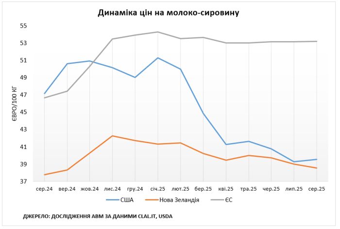Європа. За даними Єврокомісії, у серпні 2025 року середня ціна на молоко-сировину в ЄС становила 53,23 євро за 100 кг, що на 0,8% більше ніж у липні 2025 року. Вірогідно, суттєвого зростання закупівельних цін в ЄС не відбулося під впливом зниження світових цін на вершкове масло та збільшення пропозиції біржових товарів внаслідок скорочення експорту. В перспективі ріст цін на молоко-сировину в Європі може стримувати збільшення імпорту дешевого американського масла.