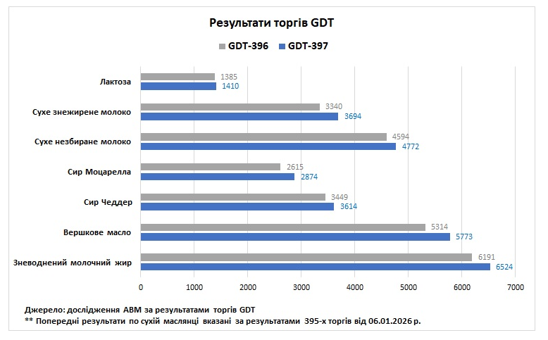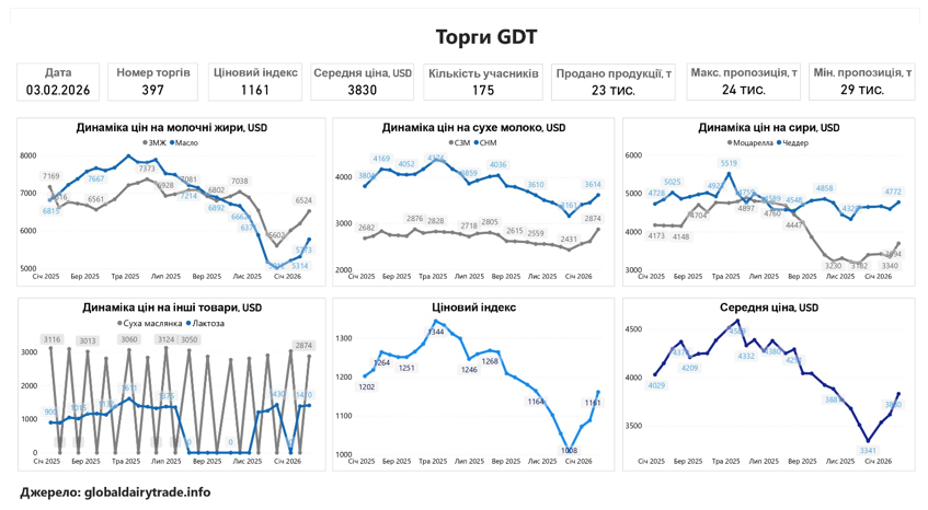 У вівторок, 3 лютого, відбулися 397-мі торги GDT, за результатами яких ціновий індекс становив 1161, що на 73 пунктів (+6,7%) більше відносно попередніх торгів. Середня ціна на молочні продукти становила 3830 дол./т, що на 215 дол. більше відносно результатів попереднього аукціону. Під час торгів було продано 22714 т біржових товарів, що на 5107 т менше порівняно з результатами минулого аукціону. Мінімальна пропозиція була зафіксована на рівні 28866 т, а максимальна — на рівні 24034 т. В торгах взяли участь 175 операторів молочного ринку, що на 11 компаній більше ніж 20 січня.