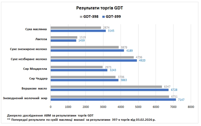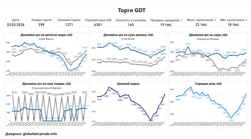 У вівторок, 3 березня, відбулися 399-ті торги GDT, за результатами яких ціновий індекс становив 1271, що на 69 пунктів (+5,7%) більше відносно попередніх торгів. Середня ціна на молочні продукти становила 4301 дол. за т, що на 273 дол. більше відносно результатів попереднього аукціону. Під час торгів було продано 18 861 т біржових товарів, що на 3379 т менше відносно результатів минулого аукціону. Мінімальна пропозиція була зафіксована на рівні 17 734 т, а максимальна — на рівні 21 818 т. В торгах взяли участь 165 операторів молочного ринку, що на 2 компанії менше відносно 17 лютого.