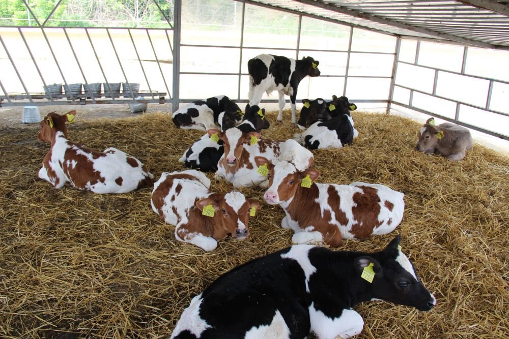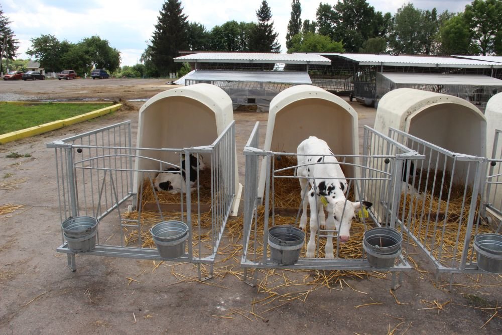 Новонародженим телятам двічі по 3 л випоюють молозиво — у першу та дванадцяту годину життя. Потім переводять в індивідуальні будиночки, де вони перебувають два місяці. До 21-го дня телятам випоюють 3 л незбираного молока двічі на добу. З 21-го до 60-го дня дають замінник — 7 л на добу, на який переходять поступово — протягом 5−6 днів. Із третього-четвертого дня життя привчають пити з відерець. Молоко й молочну суміш транспортують та дозують молочним «шатлом», що розрахований на 240 л і обслуговує 80 голів.