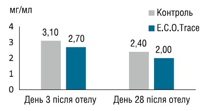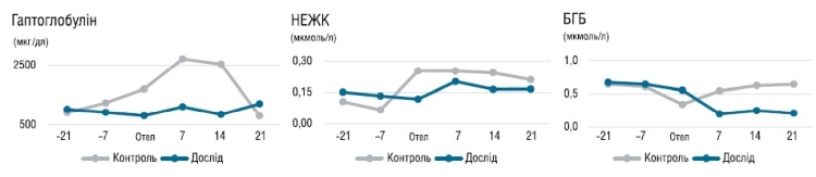 Підвищена мобілізація жиру з власних запасів організму корів у контрольній групі відображається вищим рівнем БГБ та креатиніну як маркера мобілізації білка з м'язів (таблиця 3). Показники здоров'я печінки, зокрема — білірубіну та аспартатамінотрансферази (АСТ), значно покращились в дослідній групі, яка отримувала добавку органічних мікроелементів, а отже в цих корів печінка зазнала менших пошкоджень.