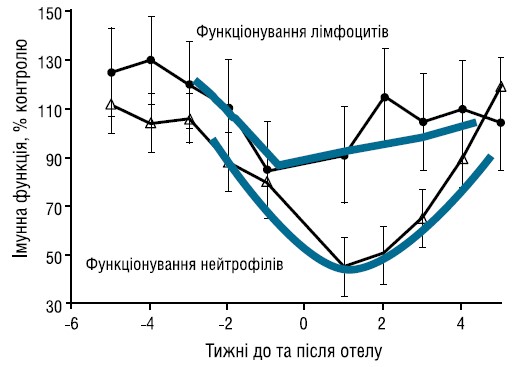 Це ослаблює і без того знижену функціональність імунної системи. «Просідання» імунної системи корови — цілком природний процес. Він починається за 2−3 тижні до отелу й сягає найнижчої точки у період між отелом і 2 днями після нього (Mezetti, 2021), див. графік 1.