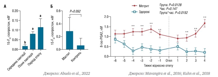 З практичної точки зору, оксидативний стрес на фермі важко якимсь чином зафіксувати на відміну від інших проблем і захворювань, які можна визначити й кількісно оцінити. Втім важливо пам’ятати, що корови у певні періоди життя і за певних умов можуть мати вищий рівень біомаркерів оскидативного стресу. Це продемонстровано на графіках 2 (А і Б) та 3. Йдеться про ізопростани — 15-F2t-ізопростан (15-F2t-IsoP) або 8-ізо-iзопрострагландин F2α (8-iso- PGF2α). Ми їх наводимо не для того, щоб запам’ятати, а розуміти, що рівень протеїнів гострої фази дуже високий, коли маємо справу зі стресом чи запальним процесом у корови, а також у період отелу.