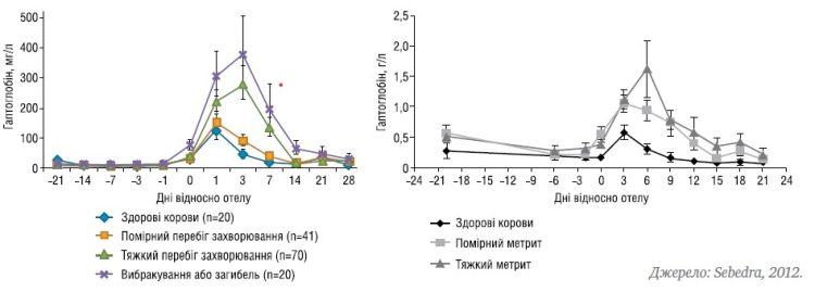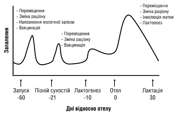 Запалення — вроджена імунна реакція на потенційно шкідливі подразники, такі як патогени, травми та метаболічний стрес (Antonelli & Kushner, 2017). Запальні процеси є нормальним явищем для всіх корів, які переходять від періоду сухостою до лактації (Bertoni et al., 2008; Trevisi and Minuti, 2018), див. схему 3. Потенційно осередком запалення може бути молочна залоза, матка, шлунково-кишковий тракт. Клінічному прояву захворювання передує імунна активація, про що свідчить підвищення рівня білків гострої фази — наприклад, гаптоглобіну, ліпополісахарид-зв'язувального білка (графіки 4−5).