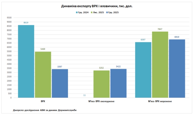 За попередніми даними Держмитслужби, у грудні 2025 року Україна експортувала близько 1,48 тис. т ВРХ живою вагою, що на 38% менше відносно листопада 2025 року і на 63% менше відносно грудня 2024 року. Грошова виручка за експортованих тварин становила 3,39 млн. дол., що на 38% менше відносно листопада 2025 року і на 61% менше відносно грудня 2024 року. У січні-грудні 2025 року Україна експортувала 18,82 тис. т ВРХ живою вагою (+4%) на суму 43,48 млн. дол. (+23%).
