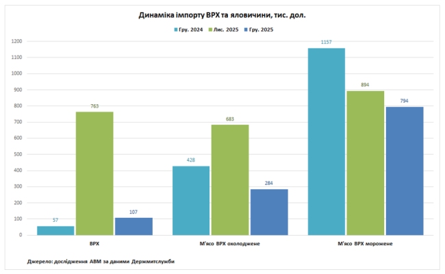 У грудні 2025 року Україна імпортувала 14 т ВРХ, що на 85% менше відносно листопада. Обсяги імпорту охолодженої яловичини скоротилися до 13 т (-77%), а мороженої яловичини до 98 т (-2%) відносно попереднього місяця. Відносно грудня 2024 року натуральні обсяги імпорту ВРХ збільшилися на 85%, охолодженої яловичини впали на 25%, а мороженої яловичини скоротилися на 52% відносно грудня 2024 року. В січні-грудні 2025 року Україна збільшила імпорт ВРХ живою вагою до 659 т (+38%), охолодженої яловичини до 189 т (+23%), але скоротила імпорт мороженої яловичини до 1,36 тис. т (-47%) відносно минулорічного періоду.