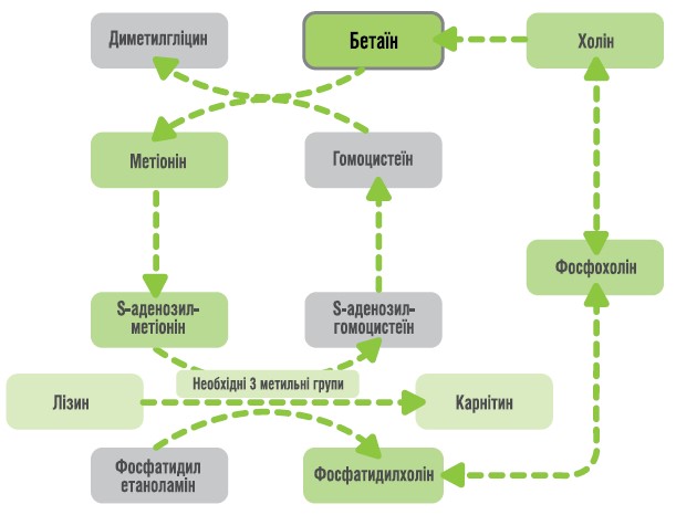 Фосфохолін і фосфатидилхолін утворюються з холіну за участю цитидиндифосфатного (CDP) холінового шляху. Утворення бетаїну з холіну є незворотним процесом. Бетаїн при окисленні надає гомоцистеїну метильну групу для утворення метіоніну. Метіонін перетворюється на S-аденозилметіонін, що є важливим донором метильної групи. Фосфатидилхолін також може синтезуватись ендогенно шляхом метилювання фосфатидилетаноламіну в триетапному процесі за участю S-аденозилметіоніну через шлях фосфатидилетаноламіну N-метилтрансферази (за матеріалами Artegoitia et al., 2014).