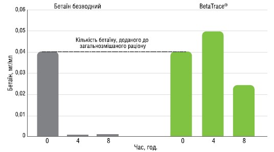 Рівні бетаїну після 4 та 8 год. інкубування в рубцевій рідині. Контроль — чистий безводний бетаїн, дослідна група — BetaTrace® (n=3).