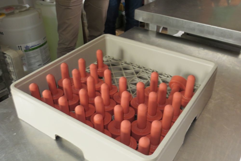 Calves are fed with whole pasteurized milk from individual bottles. It is pumped from milking parlour to dairy kitchen by underground pipeline. To save water, bottles and nipples are washed in the dishwasher.