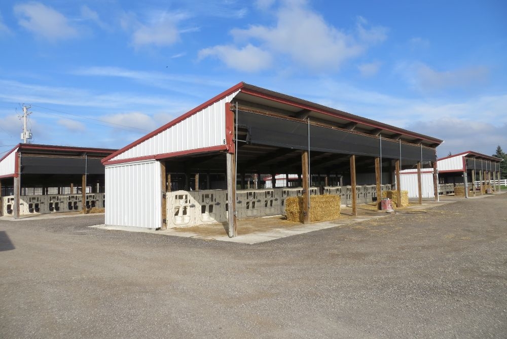 На площадке для выращивания телят молочного возраста построено 7 навесов шириной 6 м, длиной 19 м, содержащие 16 клеток (Calf-Тel). Каждый навес оборудован фронтальной регулируемой шторой. Шестнадцать телят — это то количество, которое рождается на ферме в течение 2 недель для заполнения одного навеса.