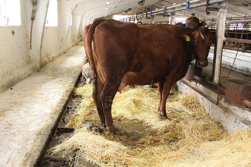 Дойное стадо от 14-го дня лактации и к запуску держат в коровнике, рассчитанном на 360 голов. В этом году в помещении установили системы охлаждения — вентиляторы и орошение. В следующем году планируют реконструкцию крыши — должны установить световой конек и окна. Пол в стойлах забетонирован и покрыт резиновой лентой.