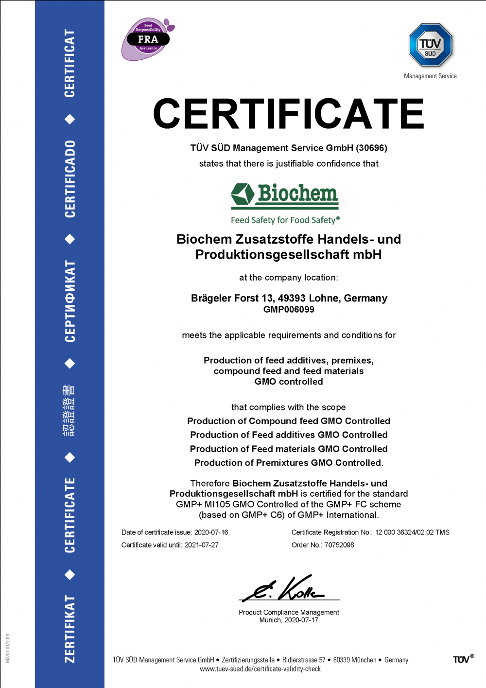 Исключение генетически модифицированных организмов (ГМО) не только играет важную роль в производстве органических продуктов животного происхождения (молока, мяса и яиц). Как правило, в Европейском союзе существует высокий спрос на пищевые продукты животного происхождения, не содержащие ГМО, независимо от того, происходят они из органических или традиционных источников. В некоторых странах, включая Германию и Францию, были приняты законы, согласно которым продукты животного происхождения (молоко, мясо и яйца) маркируются как продукты, не содержащие ГМО. Использование кормов, не содержащих ГМО, является предпосылкой для производства и маркировки пищевых продуктов, не содержащих ГМО. В рамках нашей сертификации GMP + MI105 Контроль ГМО, копания Biochem отвечает этому требованию производства и маркировки кормов как не содержащих ГМО (Контроль ГМО). Стандарт GMP + MI105 ГМО контроль является признанным сертификатом, эквивалентным немецкому стандарту VLOG.