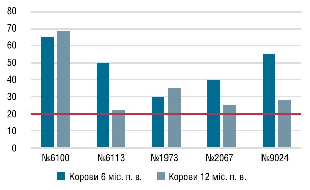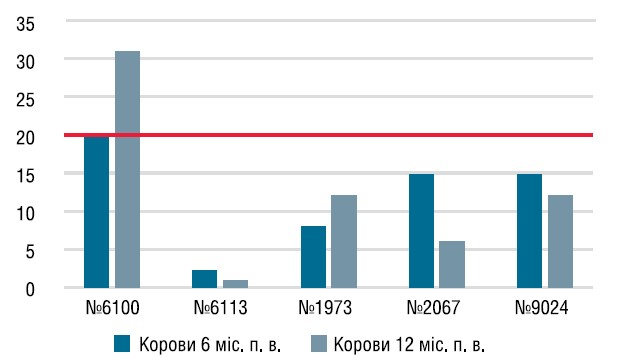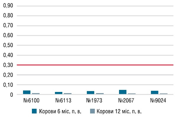 У сироватці крові корів протягом 12 місяців не було виявлено гуморальних антитіл до збудників вірусної діареї, що вказує на відсутність інфікування тварин на фоні вакцинації (графік 2). Також протягом року рівні антитіл до вірусу парагрипу-3 та респіраторно-синцитіальної інфекції були на достатньому рівні для захисту тварин від польового збудника (графіки 3−4). У поствакцинальний період відхилень від фізіологічної норми у тварин не спостерігалося.