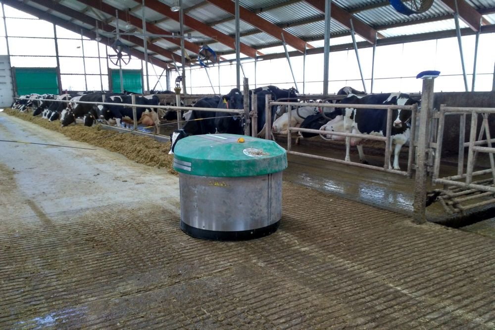 Раціон дійних корів складається з кукурудзяного силосу (2/3) і сінажу (1/3), соєвого і ріпакового шротів (4,5 кг) та мінеральних добавок. Кожні дві години робот підгортає корм.
