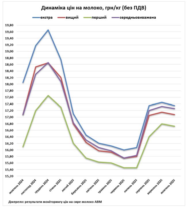 Середня закупівельна ціна молока екстра ґатунку станом на 22 жовтня становила 17,25 грн/кг без ПДВ, що на 20 коп. менше відносно попереднього місяця. Діапазон цін на цей ґатунок в господарствах варіюється від 16,90 до 18,00 грн/кг без ПДВ.