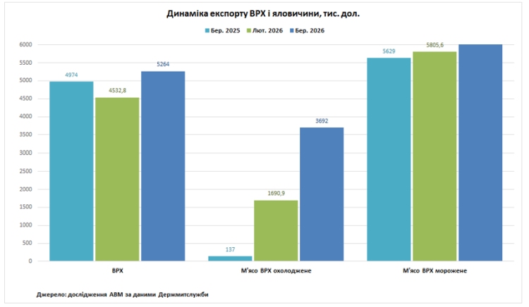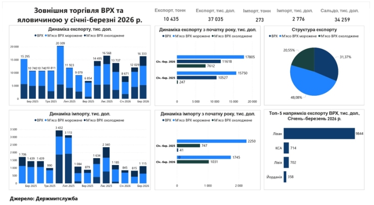 За попередніми даними Держмитслужби, у березні 2026 року Україна експортувала близько 2,79 тис. т ВРХ живою вагою, що на 58% більше відносно лютого 2026 року і на 12% більше відносно березня 2025 року. Грошова виручка за експортованих тварин становила 5,26 млн. дол., що на 16% більше відносно лютого 2026 року і на 6% більше відносно березня 2025 року. У січні-березні 2026 року Україна експортувала 5,53 тис. т (+6,1%) ВРХ на суму 11,61 млн. дол. (+10%).