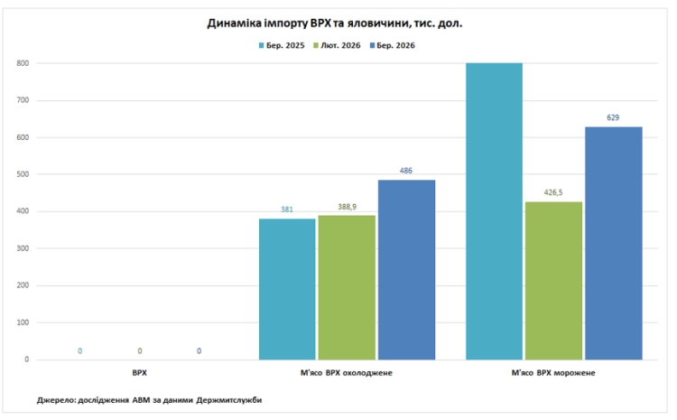 Негативний ціновий тренд на сире молоко вплинуло на імпорт нетелів в Україну. Так у березні 2026 року на відміну від попередніх років в Україну не було імпортовано жодного нетеля. Обсяги імпорту охолодженої яловичини збільшилися до 19,3 т (+41%), а мороженої яловичини виросли до 83,5 т (+20%) відносно попереднього місяця. Відносно березня 2025 року натуральні обсяги імпорту охолодженої яловичини виросли на 23%, а мороженої яловичини скоротилися на 51%.