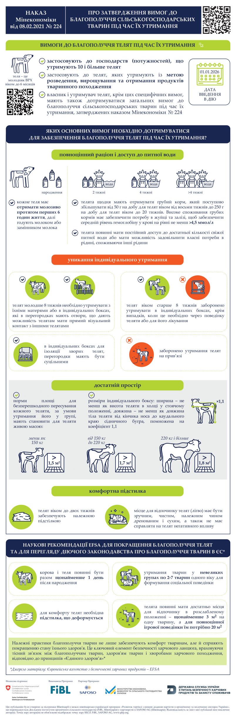 За підтримки Швейцарії, в межах швейцарсько-української програми «Розвиток торгівлі з вищою доданою вартістю в органічному та молочному секторах України» (Quality FOOD Trade Program), що впроваджується Дослідним інститутом органічного сільського господарства (FiBL, Швейцарія) у партнерстві з SAFOSO AG (Швейцарія), Міністерством економіки, довкілля та сільського господарства України та Держпродспоживслужби створено інфографіку, в якій висвітлені вимоги до благополуччя телят під час їх утримання.