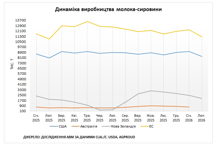 Океанія. Як повідомляє clal. it, у лютому 2026 року обсяги надою у Новій Зеландії становили 1,97 млн. т, що на 19% менше порівняно з січнем, але на 6% більше порівняно з лютим 2025 року. У січні-лютому 2026 року Нова Зеландія виробила 4,4 млн т молока-сировини, що на 3,7% більше відносно минулорічного періоду. За даними Farmers Weekly, покращення погодних умов у лютому підтримало зростання виробництва молока у Новій Зеландії. Хоча молочний ринок залишається під тиском через велику пропозицію готової продукції та нестабільний попит. Виробництво молока-сировини збільшилося завдяки сприятливим умовам на пасовищах та стабільній закупівельній ціні попри високі виробничі витрати.