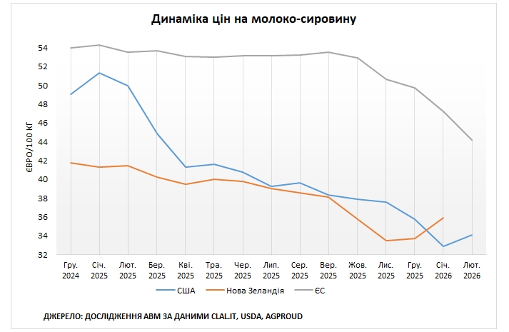 Європа. За попередніми даними Єврокомісії, у лютому 2026 року середня ціна на молоко-сировину в ЄС становила 44,19 євроцентів за кг, що на 2,13% менше ніж у січні 2026 року. Відносно ціни станом на лютий 2025 року, молоко в ЄС здешевіло на 17,77%. Збільшення пропозиції молока-сировини минулого року змусило молокопереробні підприємства надавати пріоритет виробництву вершкового масла та сухого знежиреного молока, що призвело до накопичення значних запасів продукції. Подальше відновлення цін на молоко та молочні продукти залежатиме від того, наскільки швидко ці запаси будуть реалізовані.