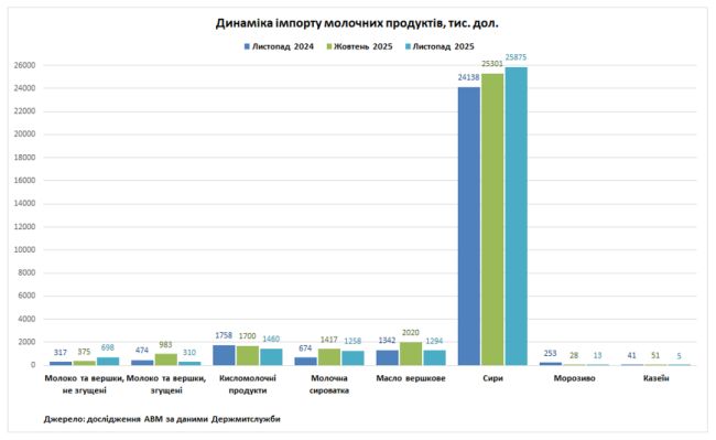У листопаді 2025 року Україна імпортувала 5,55 тис. т молочних продуктів на суму 30,91 млн дол. Відносно жовтня 2025 року натуральні обсяги імпорту скоротилися на 6%, а відносно листопада 2024 року скоротилися на 6%. В січні-листопаді 2025 року Україна імпортувала 58,16 тис. т (+10%) молочних продуктів на суму 300,65 млн. дол. (+20%). Найбільша частка від загальних натуральних обсягів імпорту в вересні 2025 року припадає на сири (64%). Найбільшим постачальником сирів в Україну в січні-листопаді була Польща з часткою в 64%. З Польщі завозилася в Україну більшість інших молочних продуктів за виключенням вершкового масла та казеїну, де перші позиції займає Німеччина.